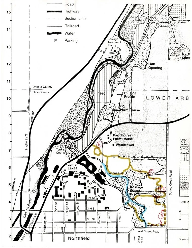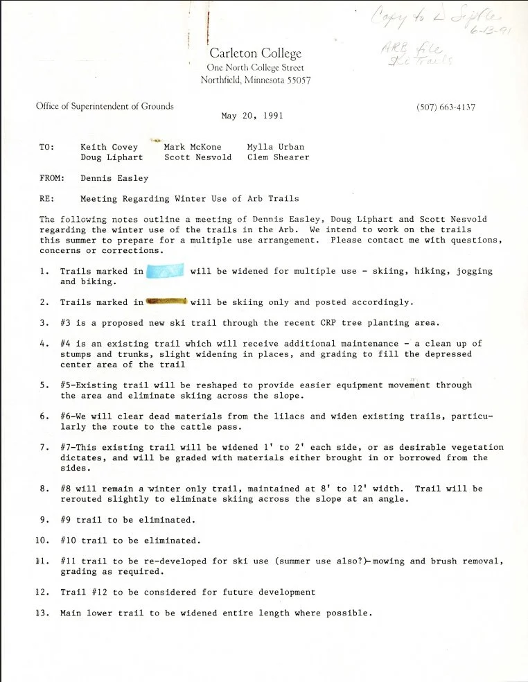 These four images show the plan that Dennis Easly, Doug Liphart, and Scott Nesvold developed for a multiple use arrangement for the winter Arb trails as a result of Liphart’s concerns about their condition for the Carleton ski team.