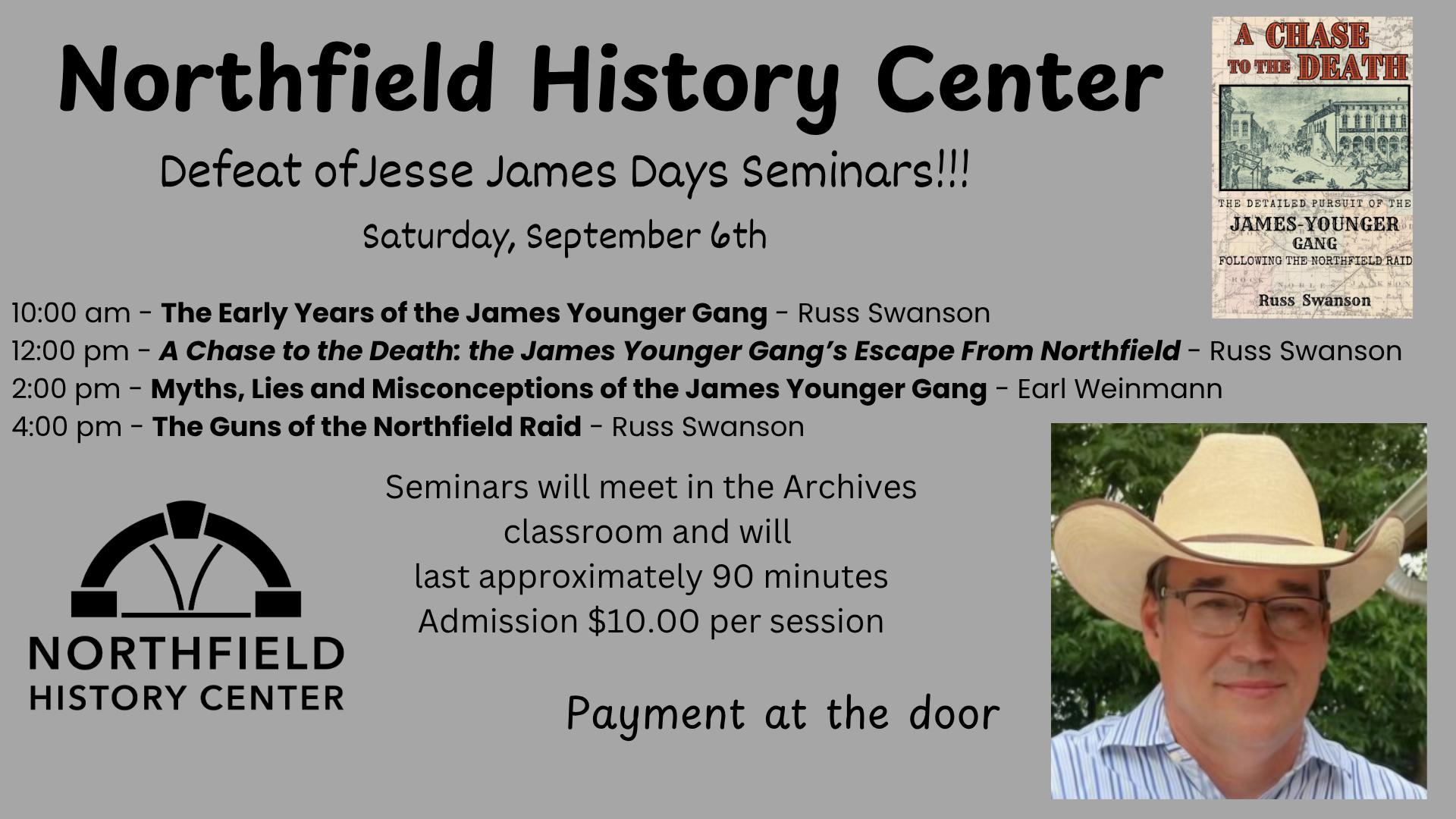 There will be a $10.00 entry fee for each Seminar if you have not signed up for the VIP Experience that is offered by the Northfield History Center. You can pay upon your arrival.